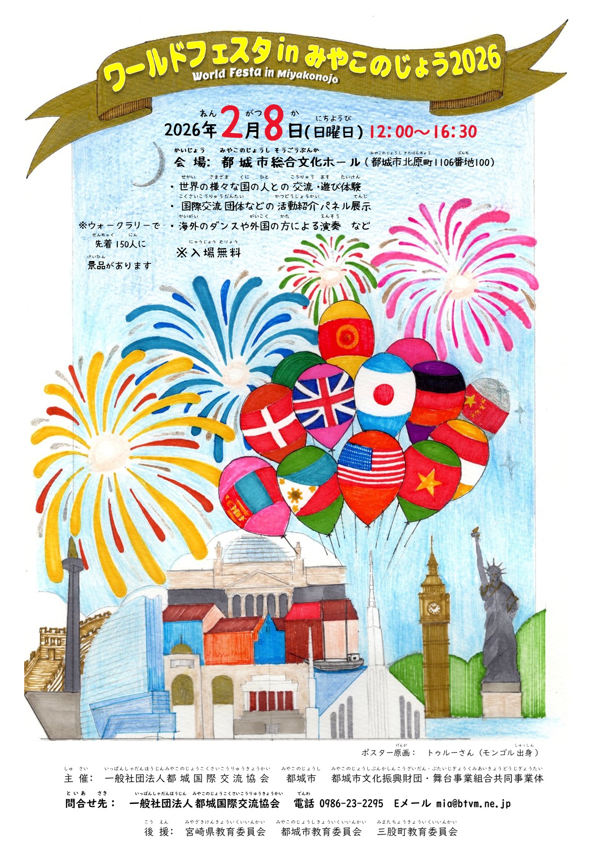 | 2025/12/03 | 2026/02/08 日曜日 12:00~16:30 会場:都城市総合文化ホールで ワールドフェスタ in みやこのじょう2026 を開催します。 PDF版チラシはこちら JPG版チラシはこちら ※ブースやステージなどでお手伝いをしてくださるボランティアスタッフも募集中です! |